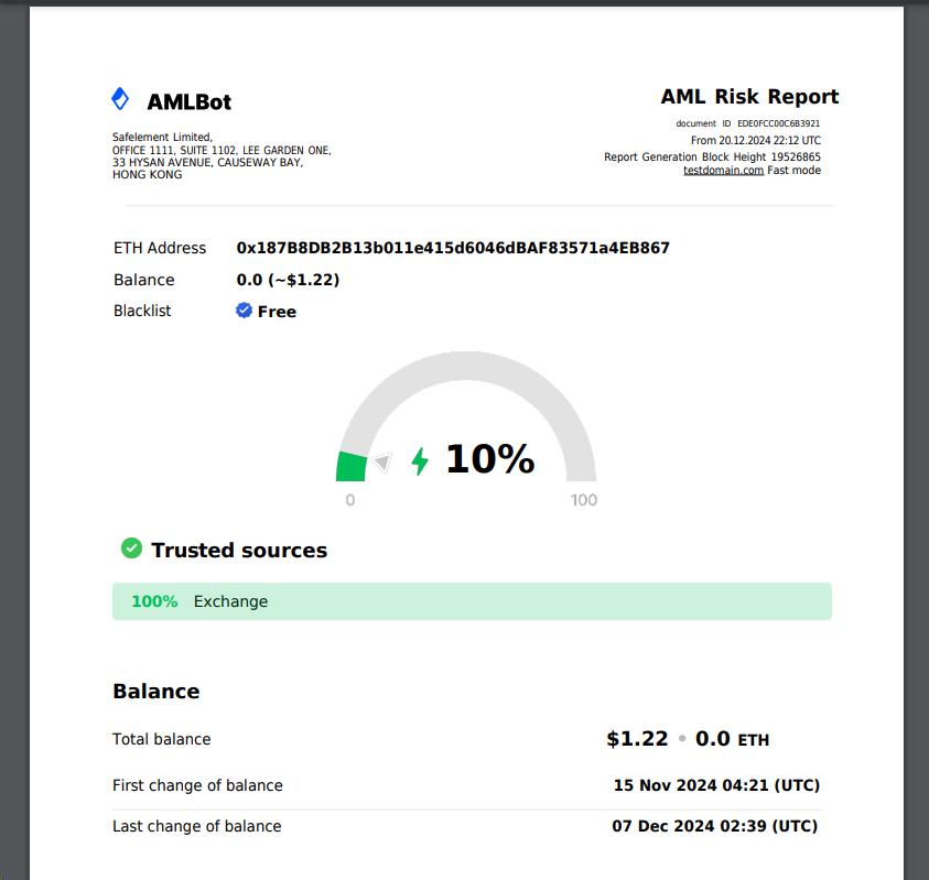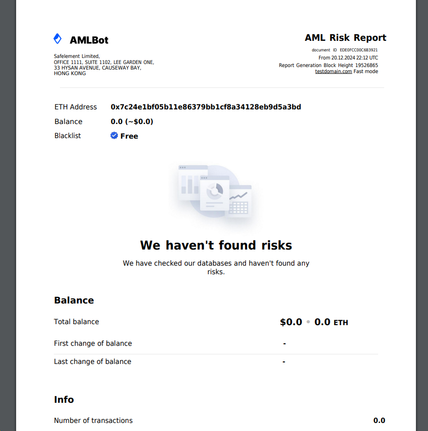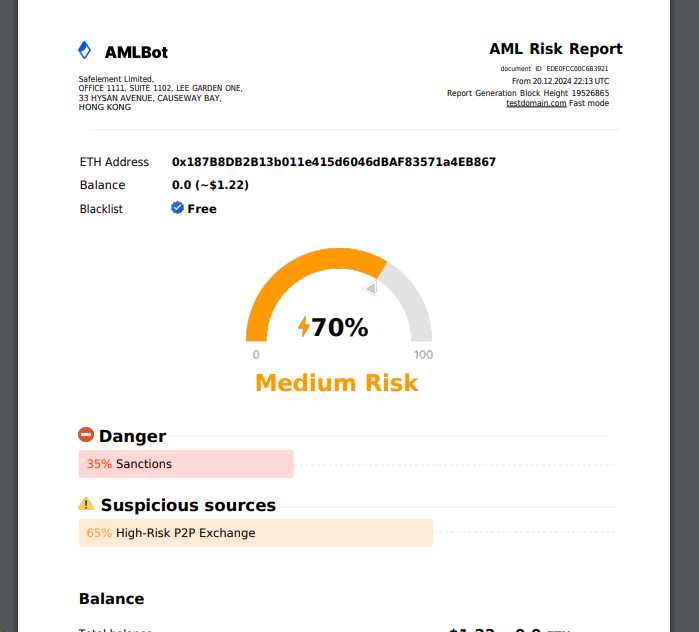 For example, if you've set the system to show AML: Medium Risk, but the user decides to test the process with an empty wallet—often as a precaution—you won't embarrass yourself by showing a High AML Risk for an empty wallet, as less experienced teams might do. This ensures credibility and professionalism in every scenario.