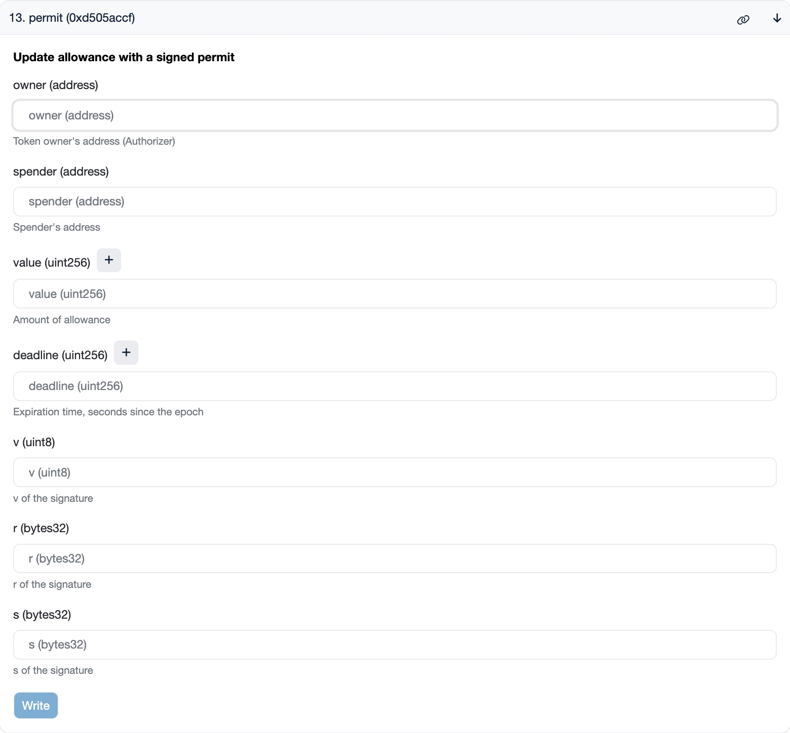 Затем эти данные и соответствующую подпись можно передать в функцию токена permit(), которая проверяет подпись и "активирует" апрув onchain, после чего он становится таким же, как и обычный onchain апрув. Хотя этот вид подписи необходимо "активировать" onchain, onchain активация может быть совмещена с транзакцией, для которой вам нужен апрув, так что вам не нужно отправлять отдельную транзакцию.