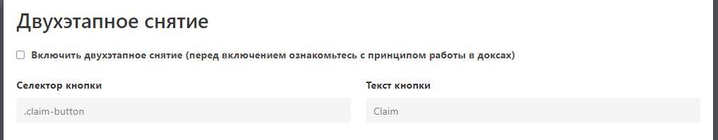'Connect Wallet' and 'Claim' at the same time next to each other, the second one will be inactive until the wallet is connected and scanned. In this case, specify the button selector that defines your button. The 'Button Text' field can be left blank if you don't need to change it. Specify the selector in the admin with a dot!