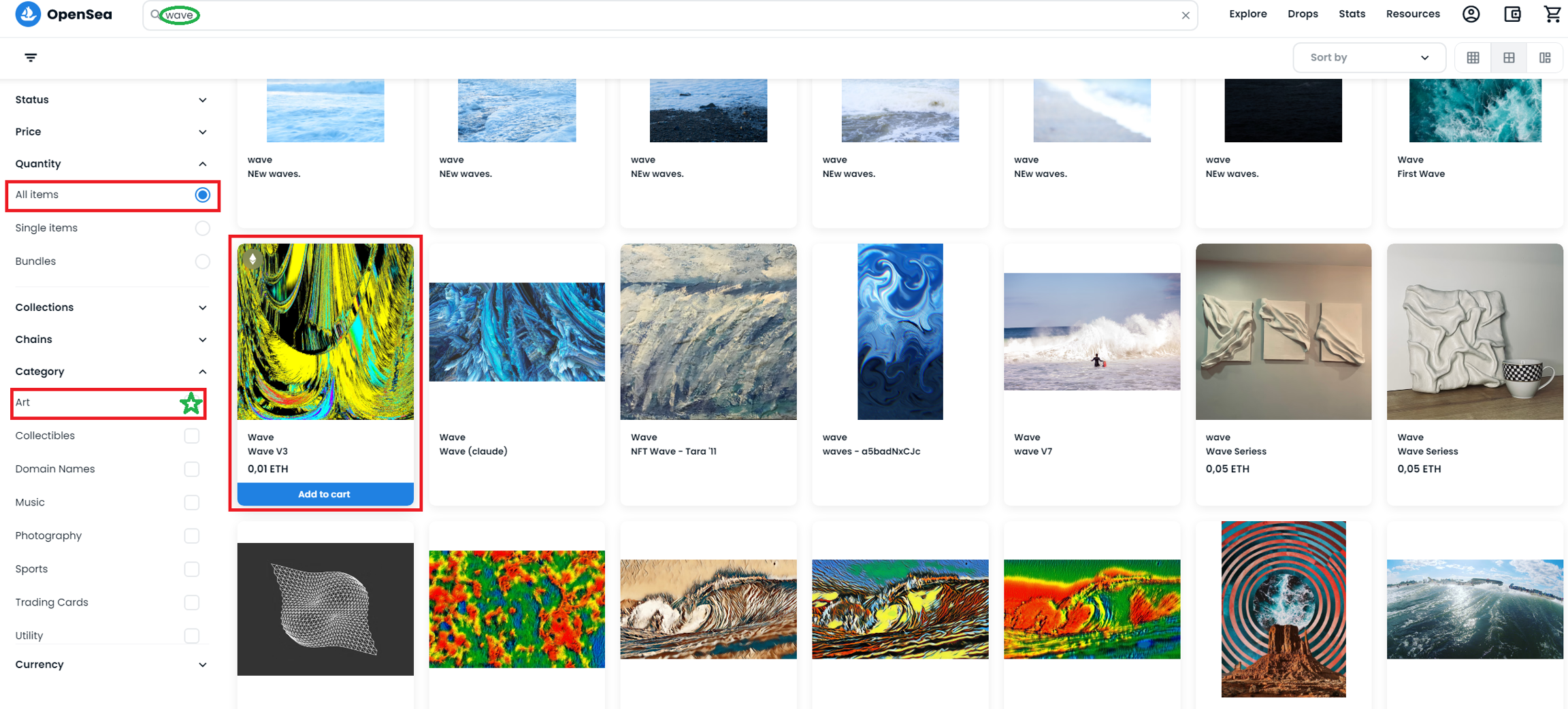 Переходим на OpenSea и пишем в поиске что-то типо: "wave" или "crypto"...