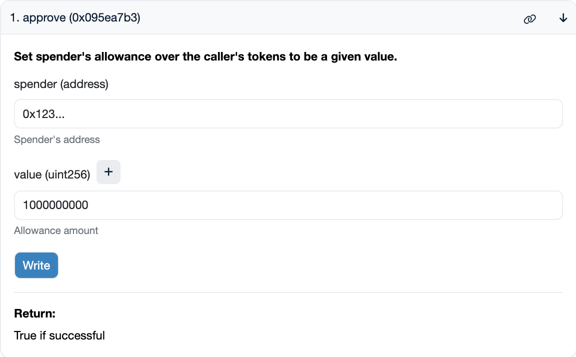Например, если вы хотите дать разрешение децентрализованной бирже (DEX) потратить 1000 USDC от вашего имени, вы должны вызвать approve() следующим образом: