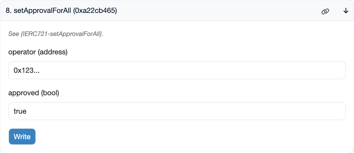 Например, если вы хотите дать апрув OpenSea на передачу любого вашего NFT от вашего имени, вы должны вызвать setApprovalForAll() следующим образом: