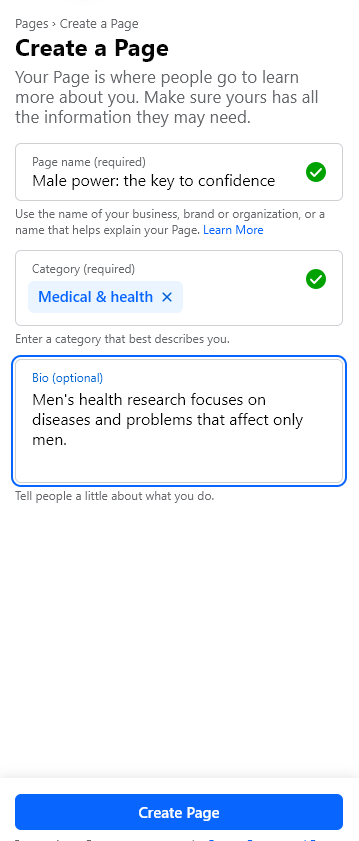 После подготовки материалов и ожидания необходимого времени, заходим в аккаунт и создаем страницу.